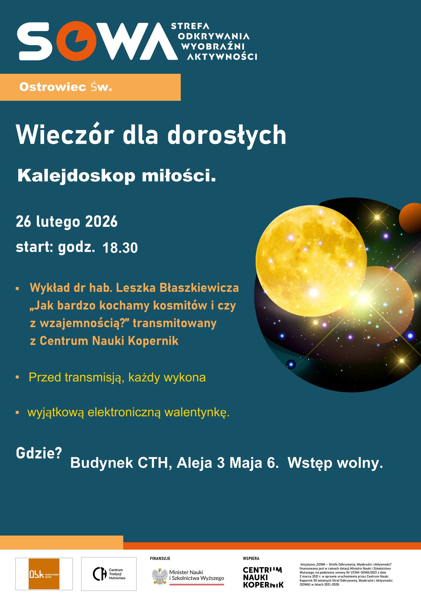 Już 26 lutego 2026 r. zapraszamy na wyjątkowe spotkanie dla dorosłych w ramach inicjatywy SOWA – Strefa Odkrywania, Wyobraźni i Aktywności.